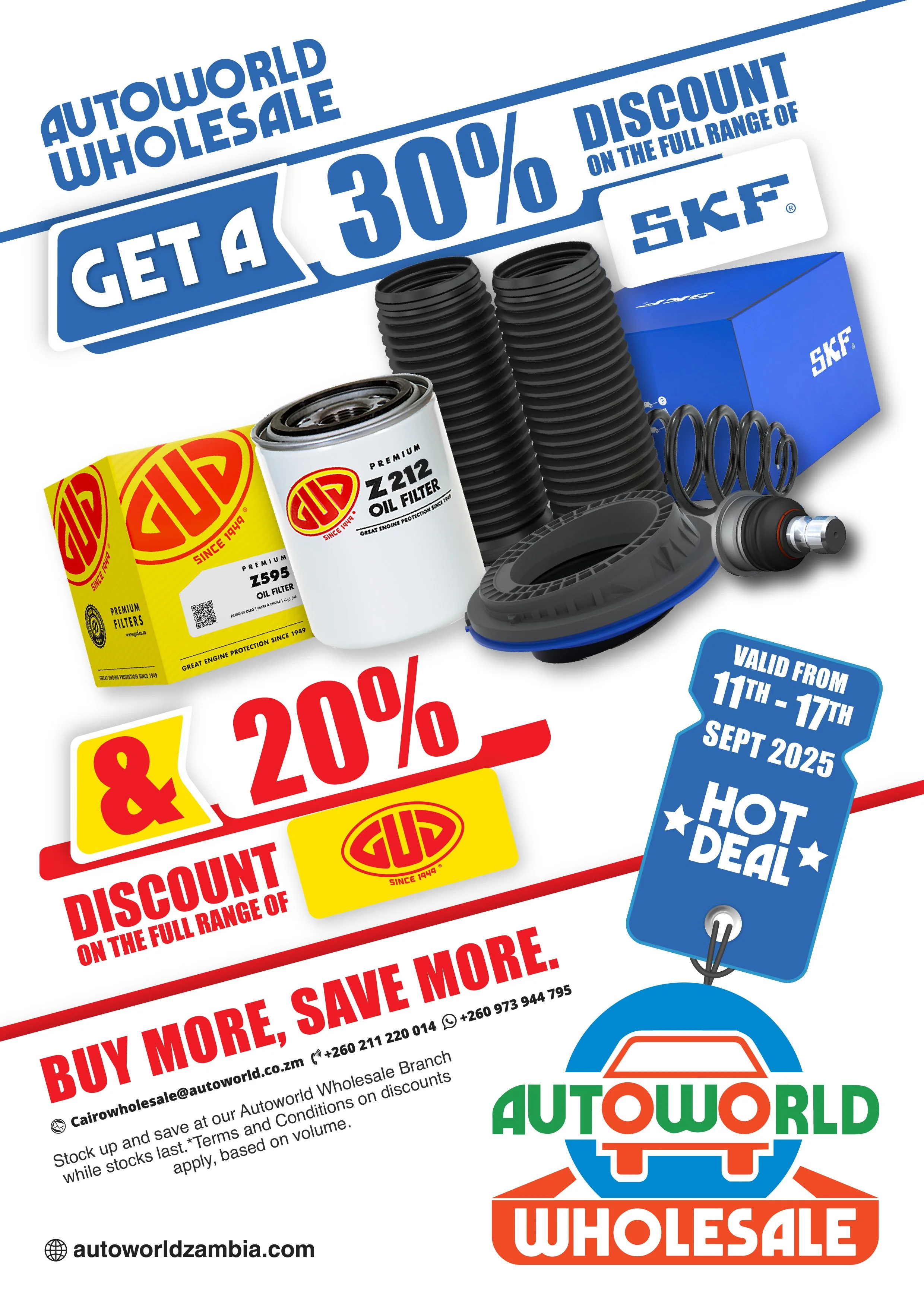 Why settle for one bloom when you can have a bouquet? Spring’s sprung—and so have the savings! Autoworld Wholesale Zambia is serving up a double scoop of discounts this September with 30% discount off the full range of SKF and a 20% discount of the full range off GUD filters. Volume-based, while stocks last! Swing by 683 Cairo Rd, Lusaka or call us at +260 973 944 795 to grab your deal!
