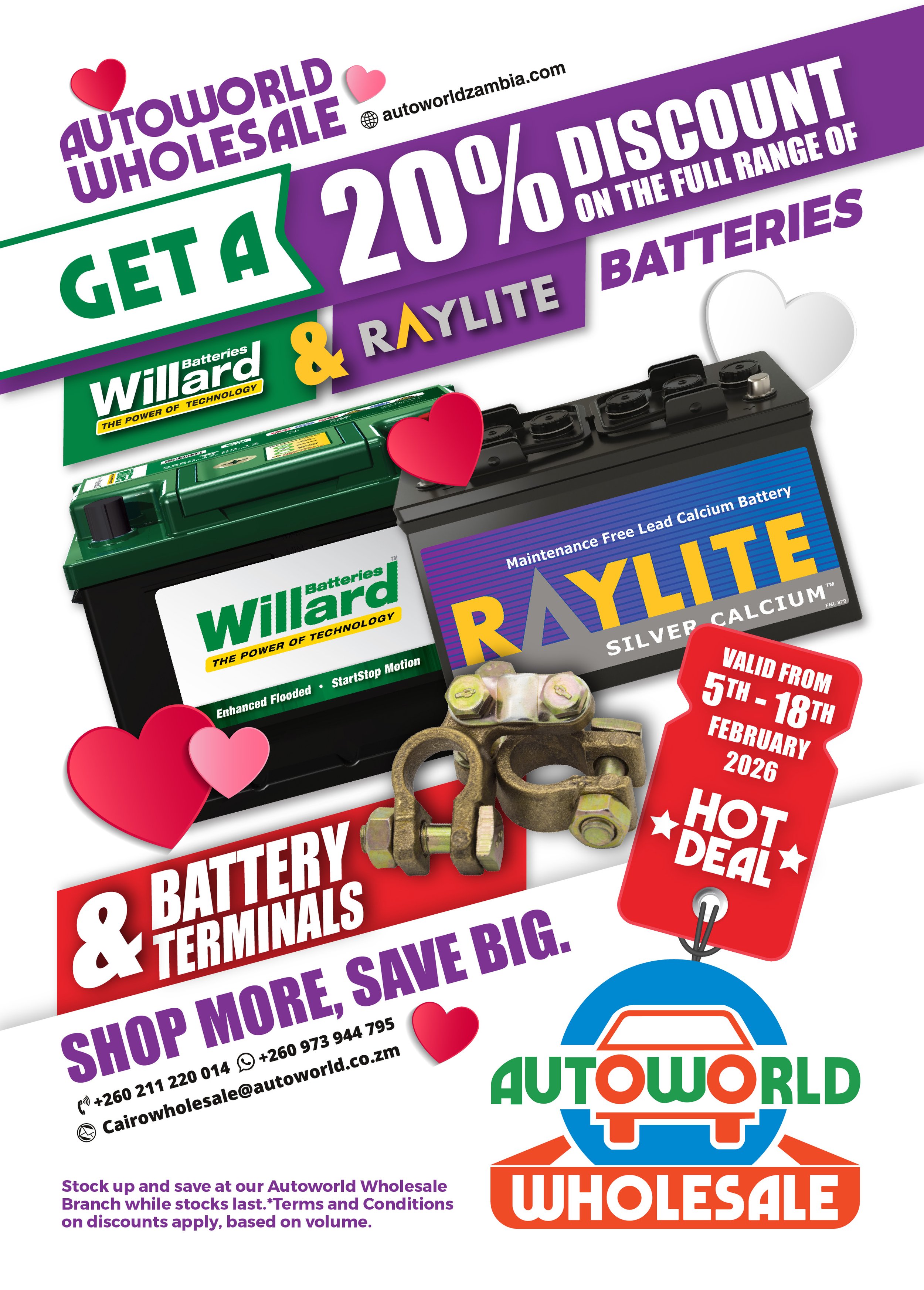 Bulk buyers, it’s time to turn up the power! From 5–18 February, Autoworld Wholesale is dropping a HOT DEAL you can’t afford to miss: 20% off the full range of Willard and Raylite batteries, plus battery terminals. Whether you’re stocking up for resale, fueling fleets, or keeping your operations charged, the bigger your buy, the bigger your savings. Unbeatable value, while stocks last!